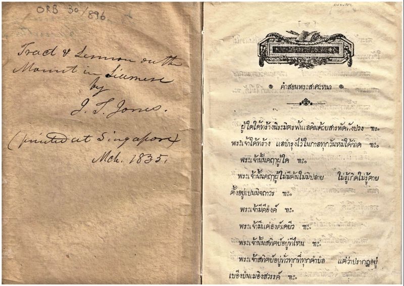 [Jones, John Taylor] <1802 – 1851>: คำสอนพระสาศะหนา. -- [Singapore, 1835]. -- "Religionsunterweisung", eine Zusammenfassung des Matthäusevangeliums.
