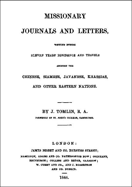 Tomlin, Jacob <1793 - 1880>: Missionary journals and letters, written during eleven years residence and travels among the Chinese, Siamese, Javanese, Khassias, and other eastern nations. - London : Nisbet, 1844. -- 384 S.