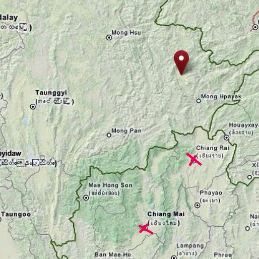 Abb.: Lage von Kentung (ၵဵင်းတုင် - เชียงตุง), Chiang Rai (เชียงราย) und Chiang Mai (เชียงใหม่)