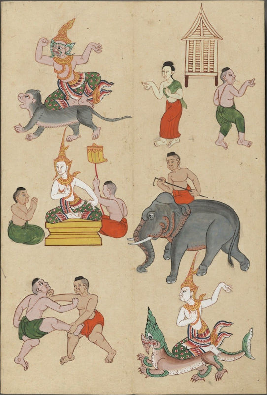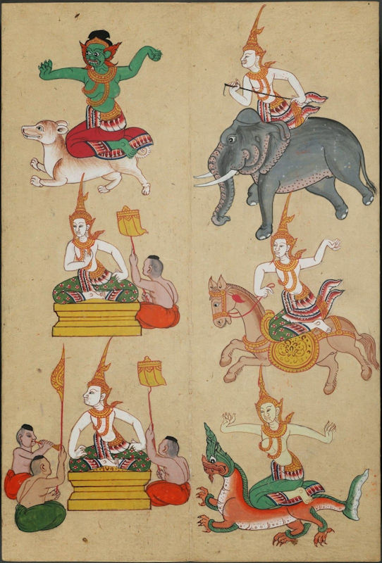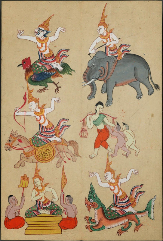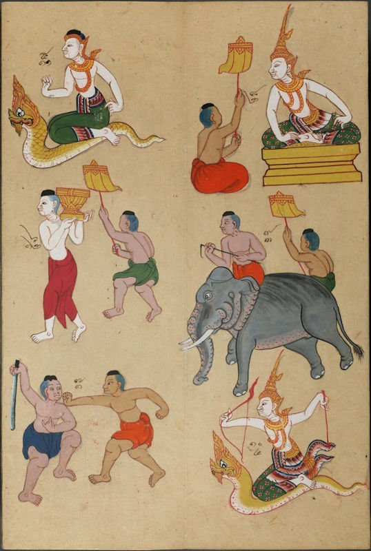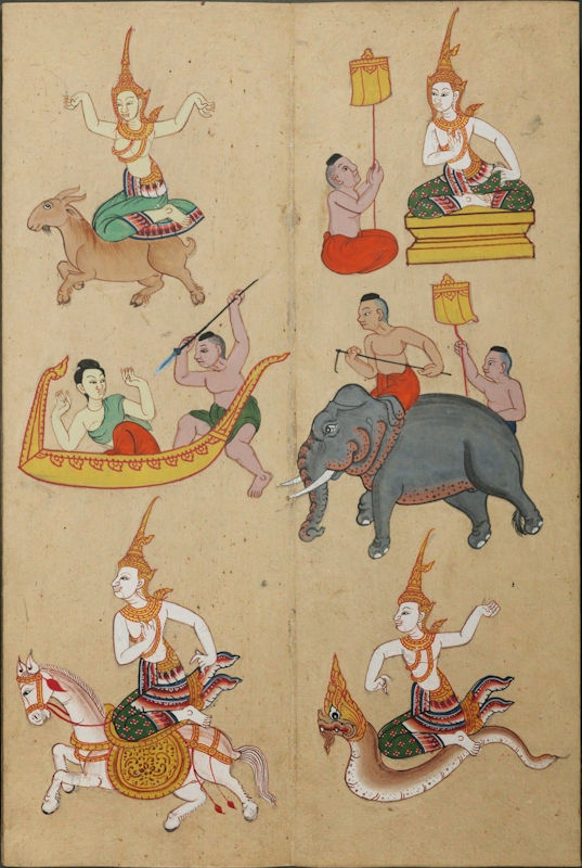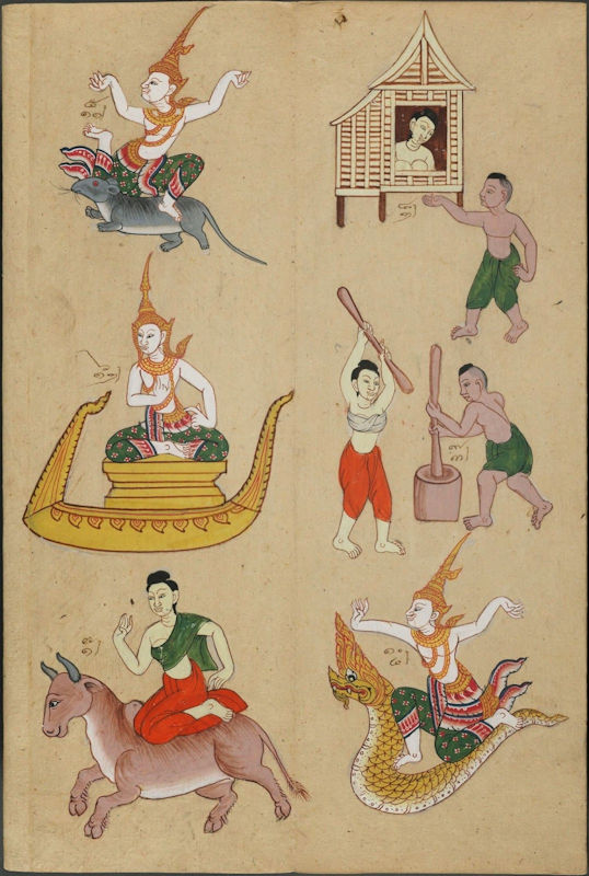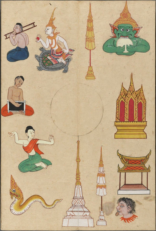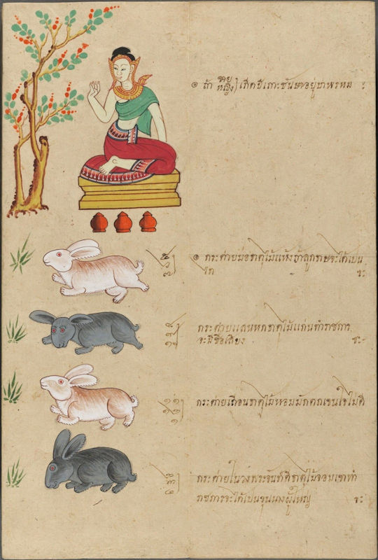 Beispiele aus dieser Handschrift (Bildquelle: http://bibliodyssey.blogspot.de/2014/04/thai-fortune-telling-manuscript.html. Zugriff am 2015-10-30. -- Creative Commons Lizenz (Namensnennung, share alike))