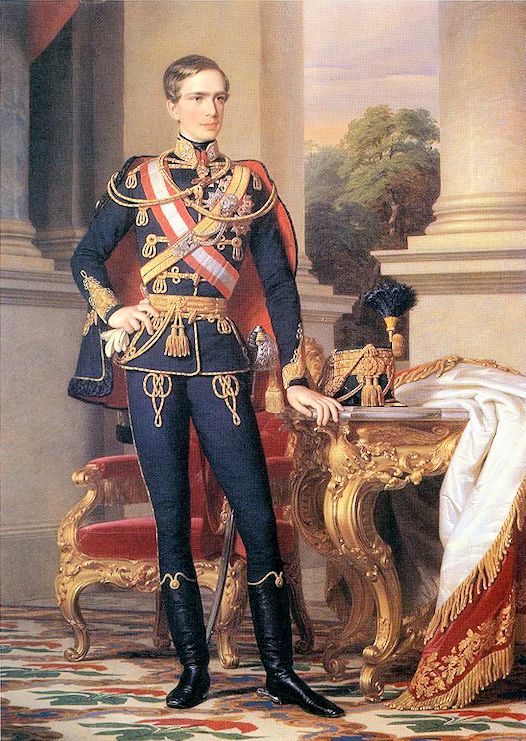 Franz Joseph I. (I. Ferenc József ungarisch, František Josef I. tschechisch, Franciszek Józef I polnisch, Franjo Josip I. kroatisch, Francesco Giuseppe I italienisch, František Jozef I. slowakisch, Franc Jožef I. slowenisch, Фрањо Јосиф (Franjo Josif) I serbisch, Francisc Iosif I rumänisch, Франц Йосиф I ruthenisch) (1830 - 1916) ist Kaiser von Österreich.