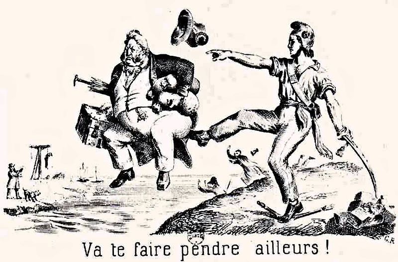 Abb.: Karikatur auf die Vertreibung des "Bürgerkönigs" Louis Philippe: Illustration zu einem Revolutionslied, 1848 (dt. etwa: "Scher dich zum Teufel!")