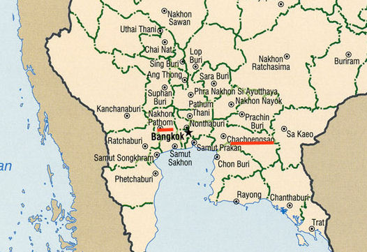 Abb.: Lage von Nakhonchaisi [นครชัยศรี = Nakhon Pathom - นครปฐม] and Petriu [= Chachoengsao - ฉะเชิงเทรา]