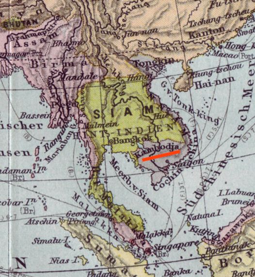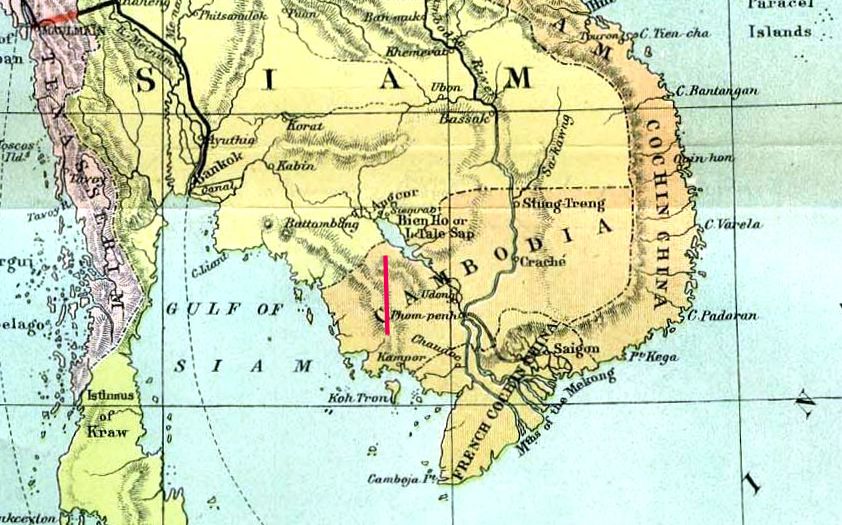 Siam. Il en résulterait que l'empire siamois deviendrait notre voisin immédiat, serait maître ainsi des deux grandes artères fluviales au dessus de Panomping [ភ្នំពេញ] [Phnom Penh] et pourrait ainsi, sous la direction d'agents étrangers, jaloux de notre progrès, entraver tout le commerce de la Basse Cochinchine.'[Zitiert in: Tuck, Patrick J. N.: The French wolf and the Siamese lamb : the French threat to Siamese independence, 1858-1907. -- Bangkok : White Lotus, 1995. -- 434 S. : Ill. ; 22 cm. -- ISBN 974-8496-28-7. -- S. 336, Anm. 15, 16]