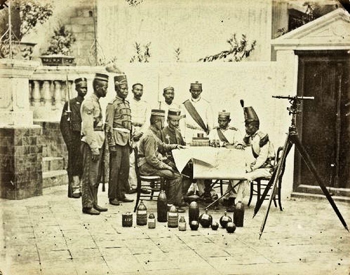 Abb.: Siamesisches Militär mit zur Schau gestellten Geschoßen, 1877