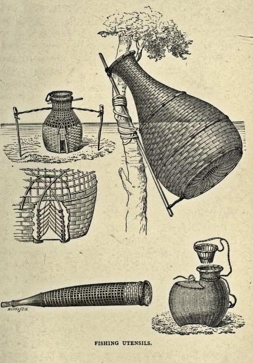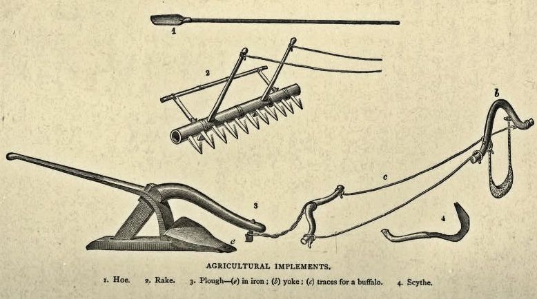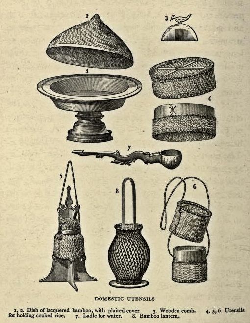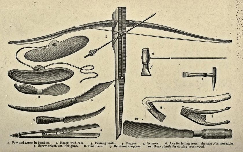 "We stopped for a while at the village of Nong Khem, on the right bank. There are extensive plantations of sugar-cane close by, besides groups of sugar-palms and rice-fields stretching away for several miles in the direction of the jungle, which as retired far from the river. To the west lies a range of low hills. There is an iron industry here, which supplies the neighbourhood with knives and hatchets, the metal being brought up from Bangkok by Chinese traders, who retail it at a little over 2d. a pound, or £21 a ton. The blacksmiths use a double air-pump, consisting of two upright bamboo tubes, having at their base slender pipes converging towards each other and working alternately so as to keep up a continual blast. The charcoal which they use is made from the mai yang, or dammar oil- tree. It is a primitive-looking arrangement, but the principle seems to be adopted all over the East, bellows being entirely unknown. They have the air-pump in Japan, but it is differently arranged there, being a wooden box in which the piston is worked horizontally by a boy sitting on the ground."
