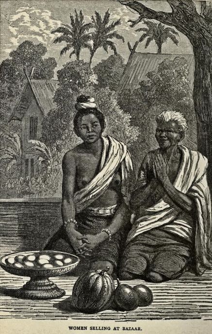 "A little before sunset I went out for a walk, and on returning through the town met a number of women coming back from their labour in the fields. As the men are obliged to work for the chief, they are in a great measure prevented from looking after their crops, and the proportion of men to women as agricultural labourers is as one to two, according to what Phya Chai Raccha told us.