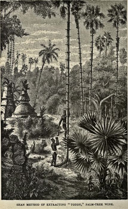 The tax on rice is two and a half per cent of the crop, which is certainly not heavy, and the royalty on teak is four rupees a log. The officials said there were no other taxes, and if they told the truth the people of Phre [แป้/แพร่] must be living under a most mild despotism. But from other sources I heard that they are sorely oppressed, and that the second chief in particular is a great brute. The gambling farm is leased to a Chinaman for 5,000 rupees a year, but the production of spirits is untaxed."