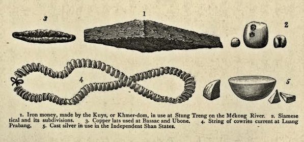 "It is a remarkable fact that the rupee has quite superseded the native silver coin among the Laos, as far as commercial purposes are concerned, and that the Siamese tical is not, and apparently never has been, current in the dependent states. The native coin which is still used in paying fines is a round "blob" of metal, flat on one side, and raised on the other, and hollow, like a flattened bubble. I frequently inquired how it was made, and though the accounts differed somewhat, came to the conclusion that the molten metal having been poured from a ladle on to a flat surface (probably a stone or a brick), the end of a slender bamboo tube is inserted into the silver before it has time to harden, and the surface raised by blowing through the tube. Finally a small stamp is impressed near the edge of the blackened and corrugated surface. The skin of the bubble is so thin that it easily yields to pressure. On the lower surface, which is much thicker, irregular, a hole is usually broken inwards. There is another silver coin made out of a small bar of silver, which is split up for the greater part of its length, the two ends being then bent round into a circular form. These are rough attempts to represent the two coins. In the Eastern Lao States there is another ancient silver coin, in the shape of a rough spindle or pencil sharpened at both ends, which is sometimes procurable in Chiengmai [เชียงใหม่]. I had made inquiries of the chief about the method of tattooing used by the Laos, and in the afternoon he came to call accompanied by his own man, who brought his tools with him. It is a simple process. The tattooing instrument I saw was seventeen inches in length, consisting of three parts. At one end were three thick strips of brass, each having six points, held together by a ring. This bundle is fixed into a brass tube, and the other end is weighted with lead. The colouring matter is said to be the gall of the wild bull or of the bear. The pattern is pricked out according to fancy, and the gall rubbed over the places, which is left to heal as best it may. The tattooing in most cases extends from the waist to below the knees, but is apparently seldom completed as on one occasion I saw a large proportion of the young fellows going about their work incompletely decorated."