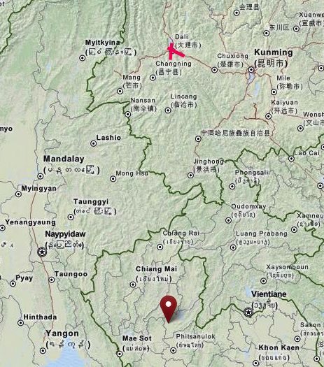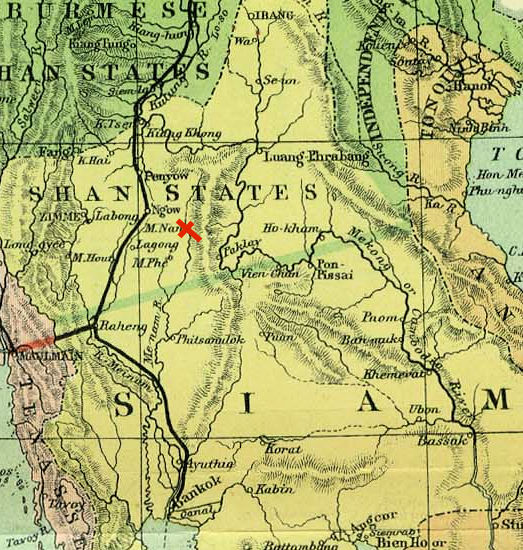 "Having heard that a caravan of Chinese had arrived at Tha-it [ท่าอิฐ], we procured ponies and rode thither, but found only two of the head men, the rest of the men being encamped further up the river. One of them spoke Pekingese: and I had some trouble to recall my small knowledge of that dialect, in order to converse with him. He said they had brought down opium for sale, but could not come to an agreement with the man who exercises the local monopoly of the drug. This man was a great traveler, and had been as far as Rangoon. He wanted a letter from me to the Bangkok authorities, and expressed his readiness to become a British subject in order to obtain it. But that of course was out of the question. These Chinese had come from Tali-fu in western Yunnan [雲南] by way of Pu-erh [Pu'er - 普洱], Szu-mao [Simao - 思茅], Chienghung [เชียงหุ่ง / เชียงรุ่ง / Chiang Rung] (where they cross to the right bank of the Me-Khong), Mu’ang Lim, Chiengsen [เชียงแสน] (where they enter the Siamese Lao provinces), Chienghai [เจียงฮาย = Chiang Rai], Prayao [Phayao - พะเยา], and Phre [Phrae - แป้ - แพร่], and had been three months on the way. They were mussulmen, and wore turbans." [Quelle: Satow, Ernest Mason <1843 - 1929>: A diplomat in Siam : H.B.M. Minister-Resident, Bangkok, 1885-88 / introduced and ed. by Nigel Brailey [1942 - 2008]. -- Rev ed. -- Bangkok : Orchid, 2000. -- 208 S. : Ill. ; 21 cm. -- (Itineraria Asiatica., Thailand ; 8). -- ISBN 974-8304-73-6. -- S. 80]