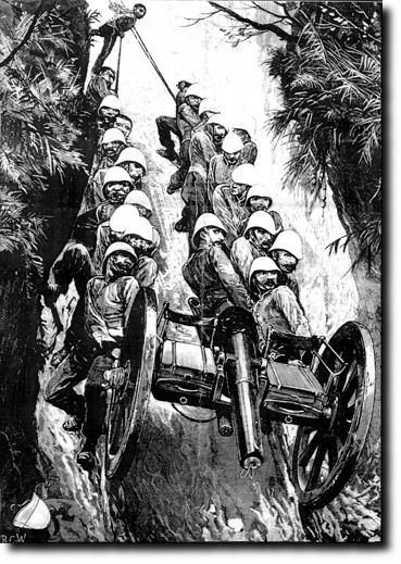 [Bildquelle: Scottish Geographical Magazine, 1886]Up to a point, he was right. The northern army quickly gave a good account of itself against small stockades of undisciplined Ho. The heavy artillery and the Gatling guns, which were cumbersome in the hills where mobility was more important than slow bombard, were left in the rear. The breech-loading Sniders of the Siamese outfired the Ho flintlocks and the clutter of Winchesters, Martinis, Enfields and Remingtons—some of them flotsam and jetsam of the Franco-Viet wars--that were charged with home-made bullets and powder. The opening skirmishes of the campaign, like European colonial wars, were sub-lieutenants' paradises in which Siamese élan and technological advantage carried the day.