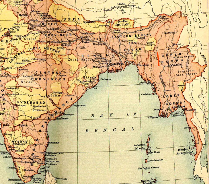 Abb.: Lage von Upper Burma (အထက်မြန်မာပြည်) (rot: British-India)