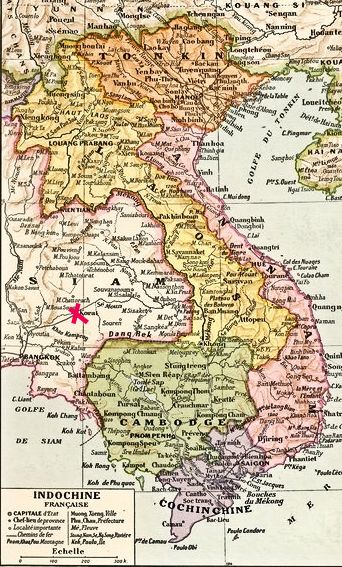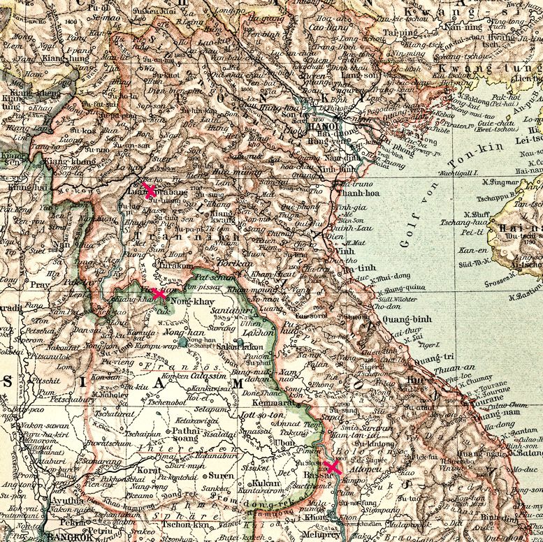 Abb.: Lage von Vien-Tiane [Vientiane - ວຽງຈັນ], Bassac [Champasak - ຈຳປາສັກ] und Luang- Prabang [ຫຼວງພະບາງ]