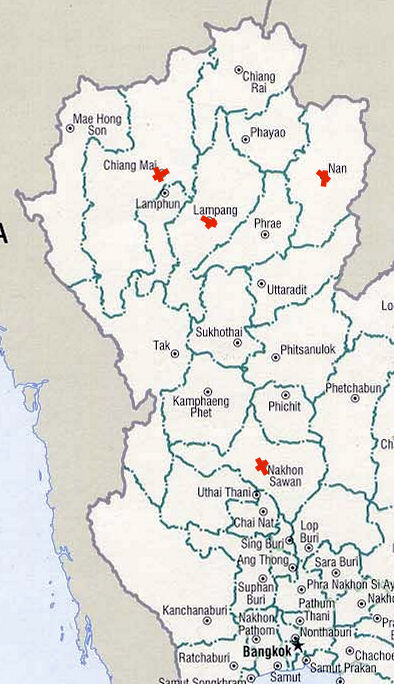 Abb.: Lage von Nan [น่าน], Lampang [ลำปาง], Chiangmai [เชียงใหม่], Nakhon Sawan [นครสวรรค์]