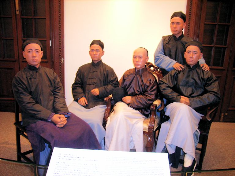 V. l. n. r.: Yeung Hok-ling (楊鶴齡, 1868 - 1934), Sun Yat-sen (孫逸仙, 1866 - 1925), Chan Siu-bak, 陳少白, 1869 – 1934), Yau Lit (尢列, 1864 – 1936). Stehend: Kwan King-leung (關景良, 1869 - 1945)