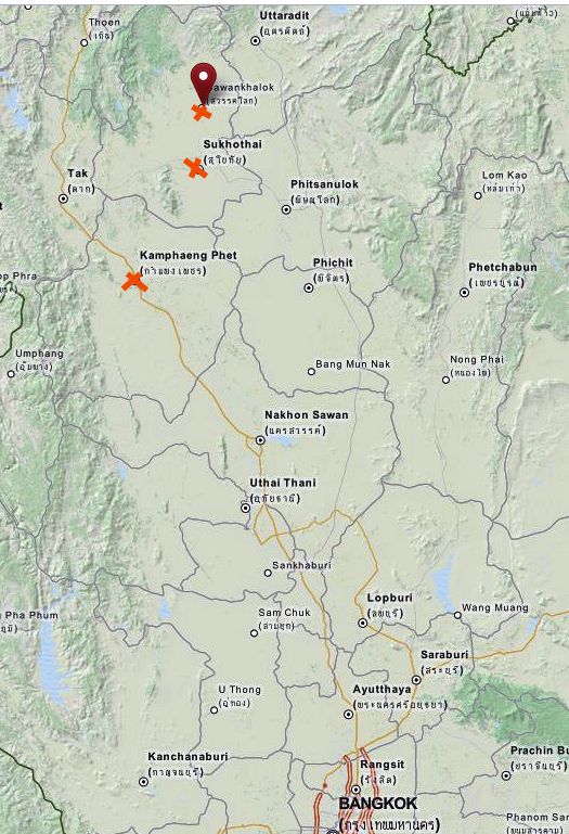 Abb.: Lage von Kamphaeng Phet (กำแพงเพชร), Sukhothai (สุโขทัย), Sawankhalok (สวรรคโลก)