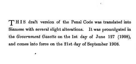 "In the King of Siam's preamble to the new Penal Code which was promulgated on April 1, 1908, and came into operation on September 21st, his Majesty the king said :