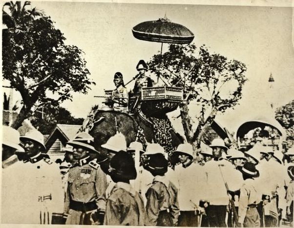 Next morning (16th), the White Elephant was bathed, and the King arrived to take part in the anointing ceremony. Having lit the candles of worship before an image of the Buddha, the King awaited the auspicious moment of nine hours, twenty-six minutes and twenty-four seconds. The young elephant, who was extremely playful and appeared to have no respect for the ceremonies, was securely tied to upright posts on the inside of the enclosed platform, and the King mounted a dais on the outside of the rail. At the auspicious moment the Head Brahman struck the gong of victory, while other Brahmans blew conches, the monks began to recite stanzas of victory, and the King anointed the White Elephant (Pl. XLV). He also fed it with red sugar-cane on which had been inscribed the name by which the animal was to be known, in future, viz. Brah Savetra Gajedejna Dilok; together with a string of titles somewhat similar to those taken by the King at the time of his coronation, i.e. honorific epithets of a kind appropriate either to a King or to a noble White Elephant.