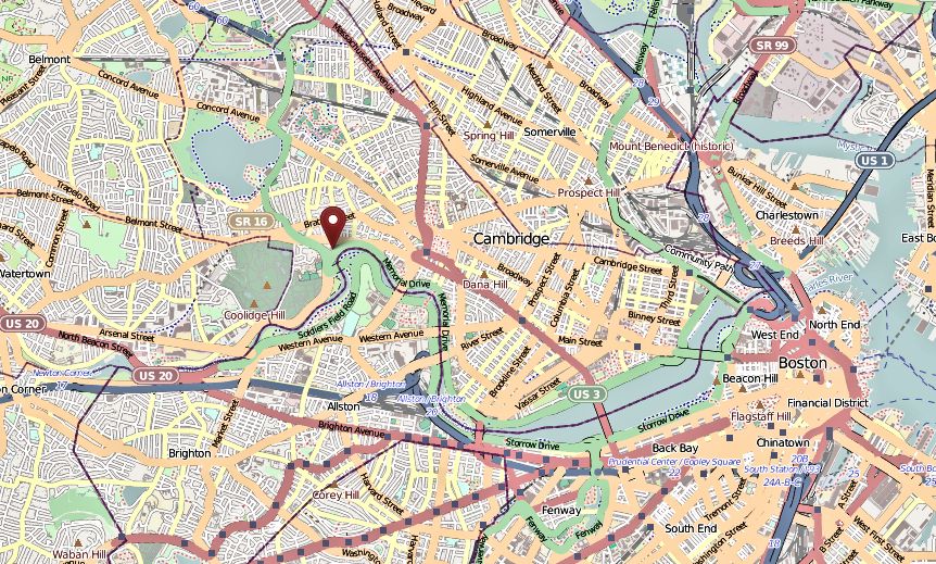 [Bildquelle: OpenStreetMap. -- Creative Commons Lizenz (Namensnennung, share alike)]Wohnadresse des zukünftigen Königs: ein Appartement mit sechs Räumen in 63, Longwood Avenue, Brookline, Norfolk County, Massachusetts