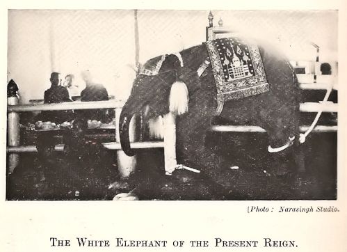 Pl. XLIII: The White Elefphant of the present Reign"The White Elephant for the present reign (Pl. XLIII) was born in captivity in 1926, its mother being one of the elephants of the Borneo Company’s herd, employed in the extraction of teak, so its appearance was not of a very romantic nature. It was presented to the King by the Company, and the mother was lent until such time as its distinguished offspring should be weaned. The two elephants were brought down from the North in a specially constructed railway carriage, supplied with electric fan and shower-bath, and made several stops of two or three days’ duration en route, in order to give the animals a chance to rest, and to give the people of some of the provincial towns an opportunity to pay homage and enjoy the festivities arranged by the provincial governors to commemorate the auspicious occasion. At each stopping place the elephants were led to a specially erected sala [สาลา], where a chapter of monks intoned appropriate stanzas, and at night the populace were regaled with theatrical performances. At the last stopping-place, Pan Pah In [Bang Pa-In, บางปะอิน], a few hours’ journey by rail from Bangkok, and the seat of the King’s summer palace, the animals arrived on 12th November, 1927, and the King, in accordance with ancient custom, made the journey up-river by launch to meet them. After inspecting them the King returned to Bangkok by water.