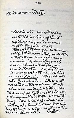 Rama VII. schreibt auf Thai ein Memorandum über Demokratie.