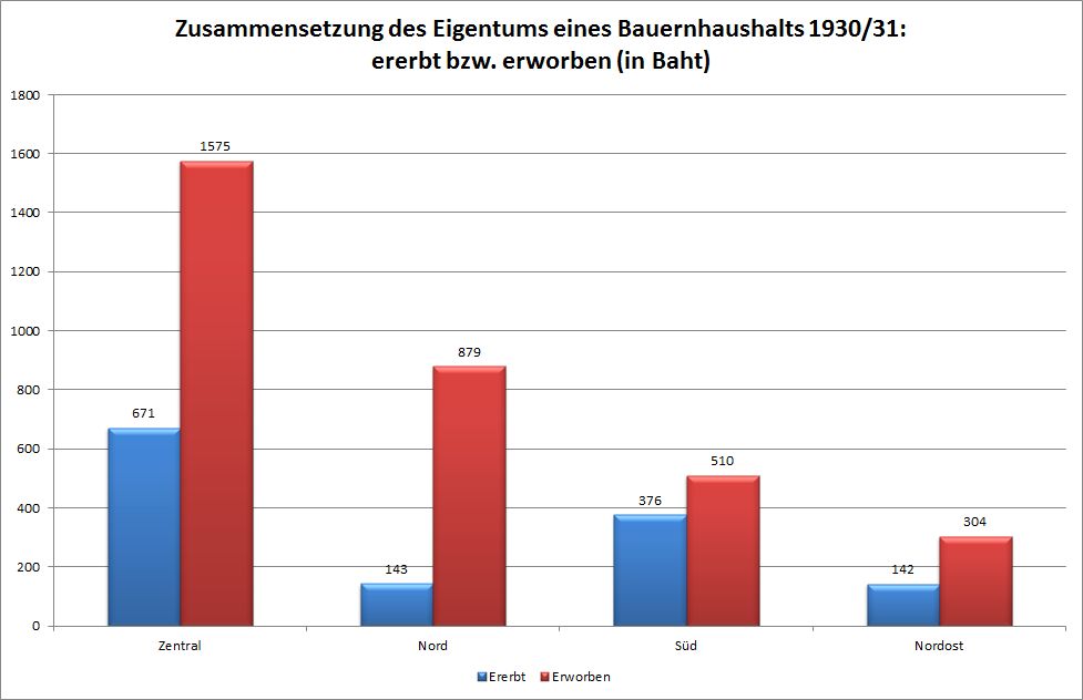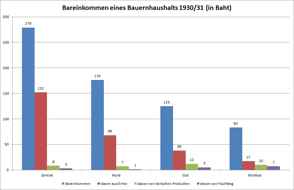Abb.: Durchschnittliches Bareinkommen eines Bauernhaushalts 1930/31 (in Baht) mit Anteil von Ernte, tierischen Produkten und Fischfang