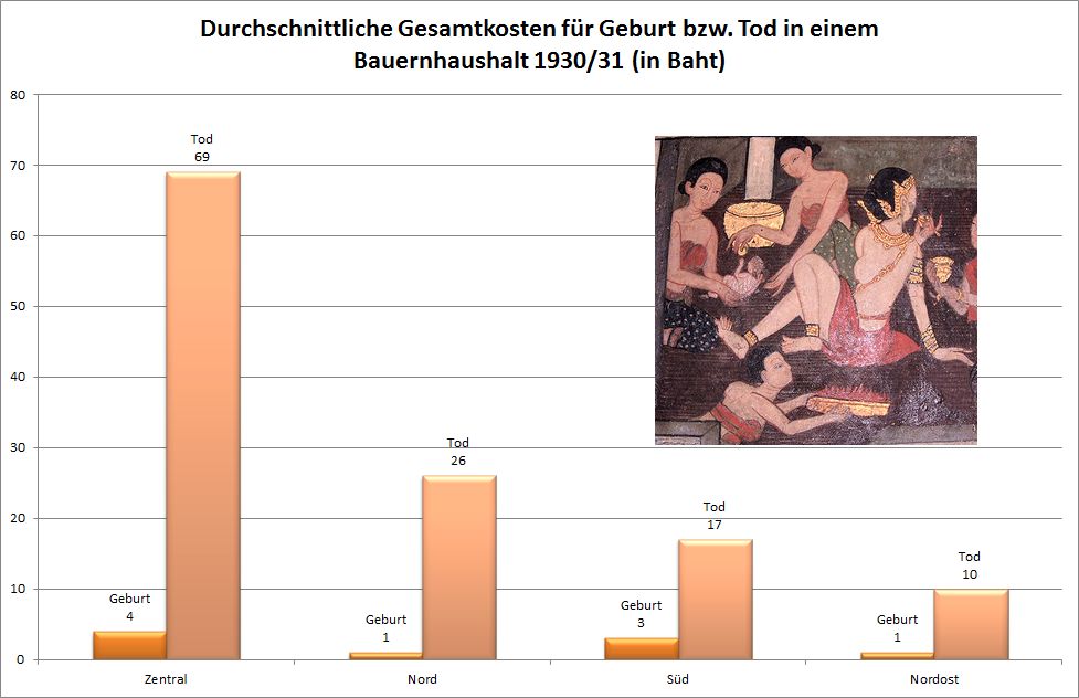 Abb.: Durchschnittliche Gesamtkosten für Geburt bzw. Tod (Kremation + Verdiensttun - ทำบุญ) 1930/31