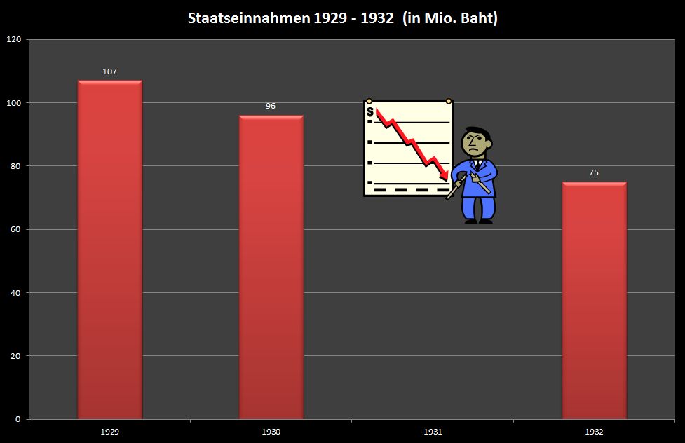 [Datenquelle: Thompson, Virginia <1903 - 1990>: Thailand the new Siam. -- New York : Macmillan, 1941. -- S. 553]Das Haushaltsjahr 1932/33 endet mit einem Defizit von 10 Mio. Baht.