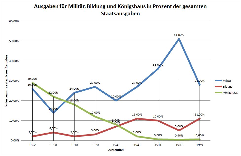 Abb.: Ausgaben für Militär, Bildung und Königshaus in Prozent der gesamten Staatsausgaben 1892 - 1949
