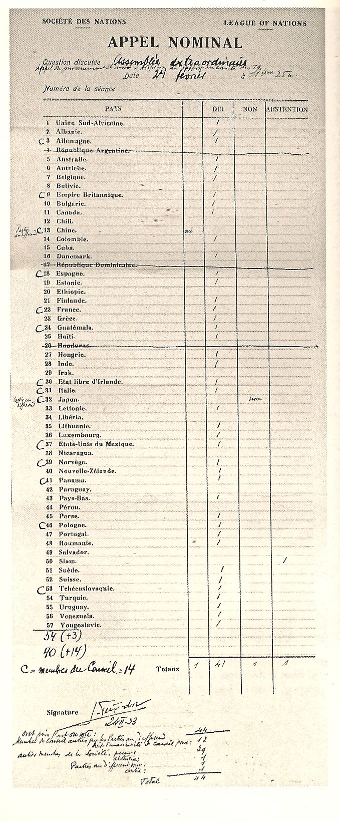 Abb.: Protokoll der namentlichen Abstimmung im Völkerbund 1933-02-24