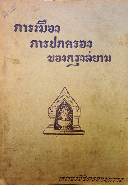 วิจิตรวาทการ [Wichitwathakan] <1898 - 1962>: การเมือง : การปกครองของกรุงสยาม [Politik : die Verwaltung Siams]. -- กรุงเทพฯ : ไทยใหม่, 2475 [= 1932]. -- 256 S. ; 19 cm