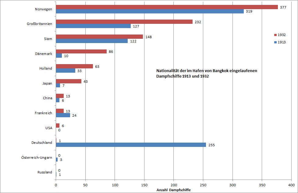 Abb.: Nationalität der im Hafen von Bangkok eingelaufenen Dampfschiffe 1913 und 1932