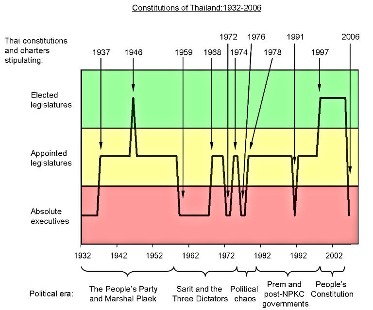 "The military aristocracy had no intention of sharing its power democratically with the whole army. The first step to prevent this had been taken in March 1933, when officers and soldiers were forbidden membership in the People’s Party; and the withdrawal of their support meant the end of its political influence." [Quelle: Thompson, Virginia <1903 - 1990>: Thailand the new Siam. -- New York : Macmillan, 1941. -- S. 306.]