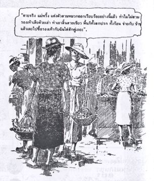 "Malaria is another very common disease. There are large sections of Siam where the disease is endemic. Some of the northern provinces are so infected with the disease that the majority of the population seem to have enlarged spleens, pale lips, and be subject to fevers. Hospitals in these areas for years derived much of their income from the sale of quinine. The value of quinine as a specific for the disease became quickly known. It was readily accepted and today is on sale very cheaply in every government dispensary or health centre, and in every medicine shop. Ignorance and lack of doctors still prevent much of the population from having the medical care needed. During some seasons it is not unusual to see a fever stricken village with one or two people sick in every home. Funeral processions are frequent. Malaria is a scourge that dissipates the physical abilities of thousands of people annually. The government has popularized a picture that compares the malarial mosquito to a tiger and purports to demonstrate that the mosquito is the more dangerous of the two. Almost everyone in Siam is familiar with the picture and yet not many houses outside of the larger population centres use mosquito nets." [Quelle: Landon (1939), S. 127f.]