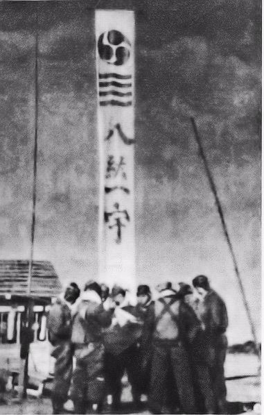 Eine Rede des japanischen Ministerpräsidenten, Prinz Fumimaro Konoe (近衛 文麿, 1891 – 1945) macht den Slogan: Hakkō ichiu (八紘一宇) - "Die achte Ecken der Welt" [unter einem Dach] populär.