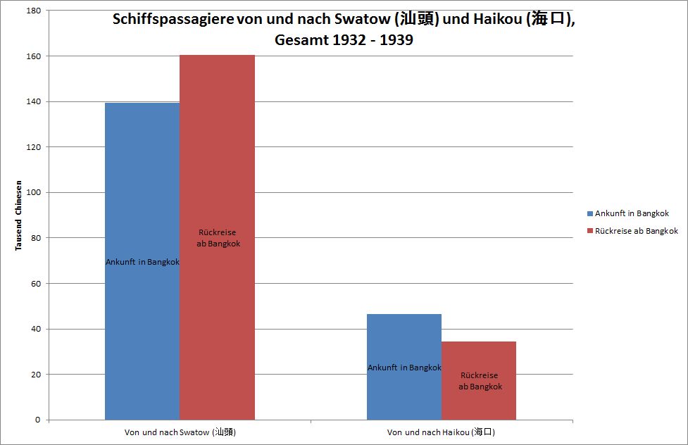 Abb.: Gesamt der chinesischen Einwanderer und Rückwanderer von und nach Swatow (汕頭, Shàntóu) und Haikou (海口, Hǎikǒu) 1932 - 1939