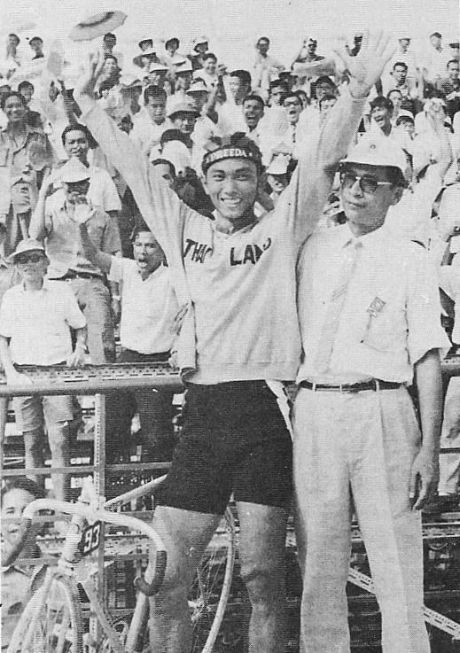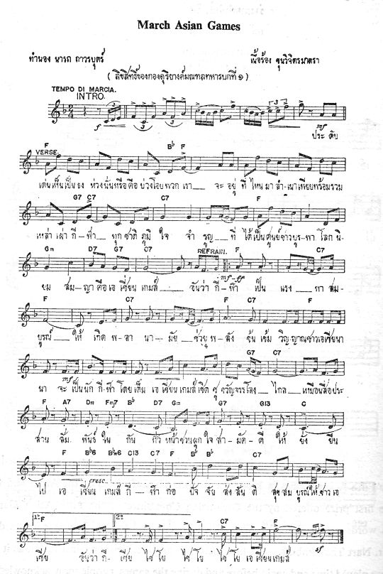 Abb.: Armee-Marsch für die Asian Games 1966 / Text: Khun Vichitrmatra (ขุน วิจิตรมาตรา, 1897 - 1980) ; Musik: Nart Thavornbutr (นารถ ถาวรบุตร์, 1905 - 1981)Für die Spiele wurde das Kittikachorn Indoor Stadium mit einer freien Spannweite von 120 Metern erbaut. Baukosten: 54 Mio. Baht.