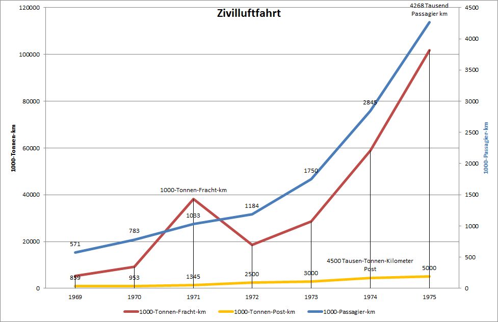 Abb.: Zivilluftfahrt: Passagiere (in 1000-km), Fracht (in 1000-Tonnen-Kilometern) und Post (in 1000-Tonnen Kilometern), 1969 - 1975