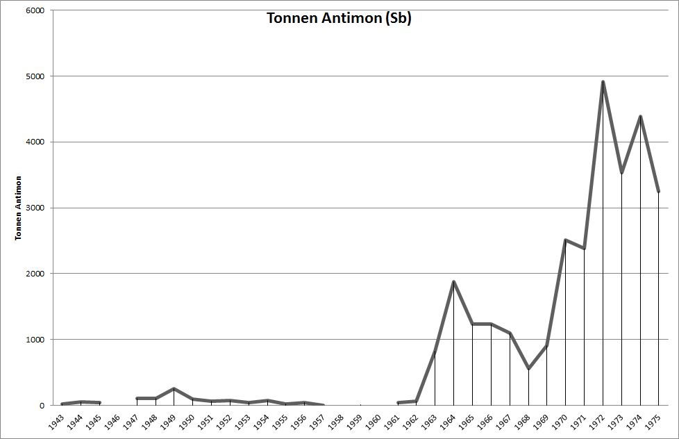 Abb.: Förderung von Antimon (Sb) (in Tonnen), 1943 - 1975