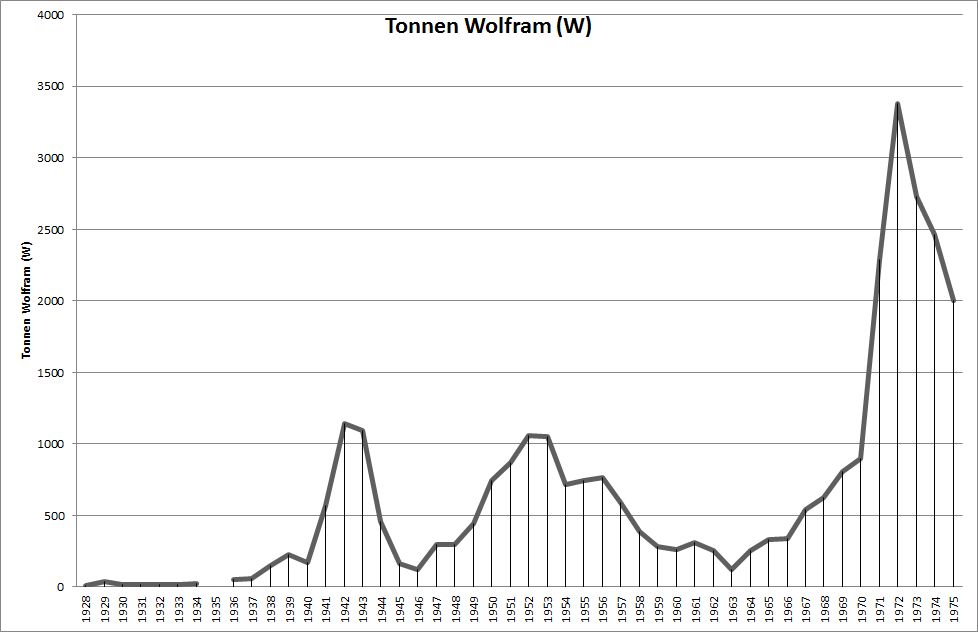 Abb.: Förderung von Wolfram (W) (in Tonnen), 1928 - 1975