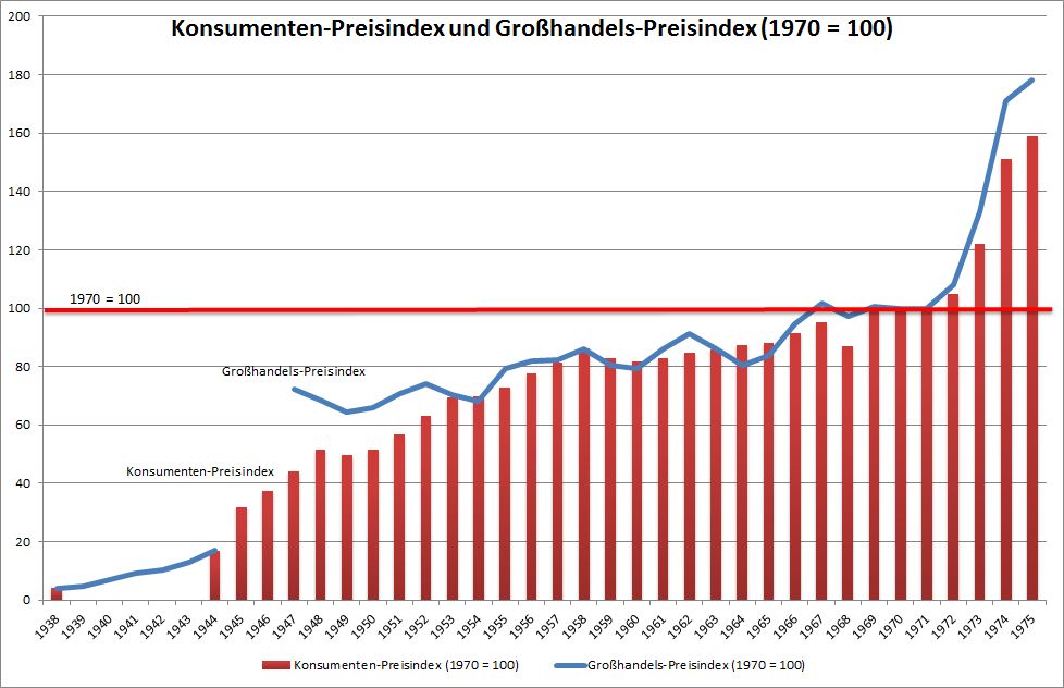 Abb.: Großhandels-Preisindex und Konsumenten-Preisindex (1970 = 100), 1938 - 1975