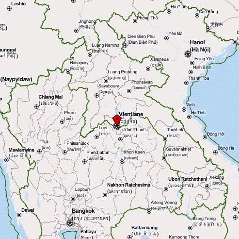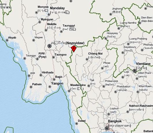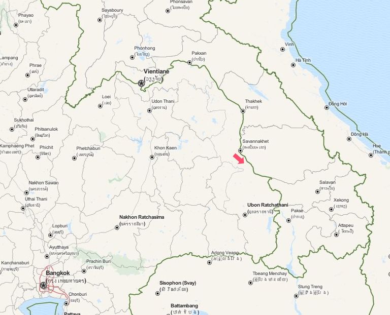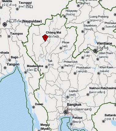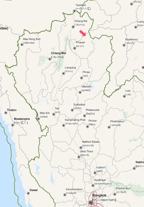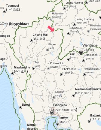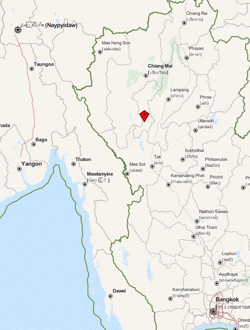 [Bildquelle: OpenStreetMap. -- Creative Commons Lizenz (Namensnennung, share alike)]Thanying Vibha besucht auf dieser Reise auch das Karen-Dorf (กะเหรี่ยง) Ban (Phrabat) Huay Tom, Amphoe Li (ลี้), Provinz Lamphun (ลำพูน). Die Bewohner dieses Dorfes wohnten ursprünglich in anderen Dörfern, folgten einem buddhistischen Mönch. Der Mönch, Kruba Chaiwongsa Pattana, genießt bei den Karen große Verehrung, obwohl er ein Nordthai ist. Er spricht die Karen-Sprache und hat die Dorfbewohner zum Buddhismus bekehrt. Sie sind sogar strikte Vegetarier.
