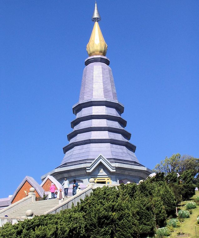 [Bildquelle: Thanya / Wikipedia. -- Public domain]Zum 60. Geburtstag des Königs errichtet die Luftwaffe auf dem Berg Doi Inthanon (ดอยอินทนนท์) das Naphamethinidon Chedi (นภเมทินีดล).