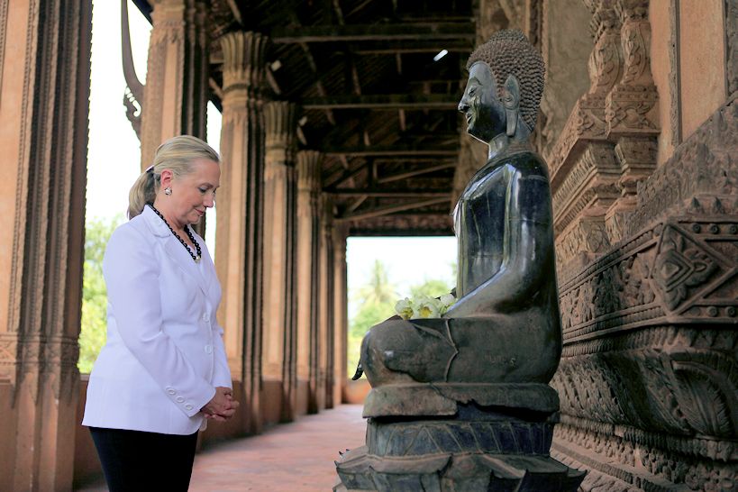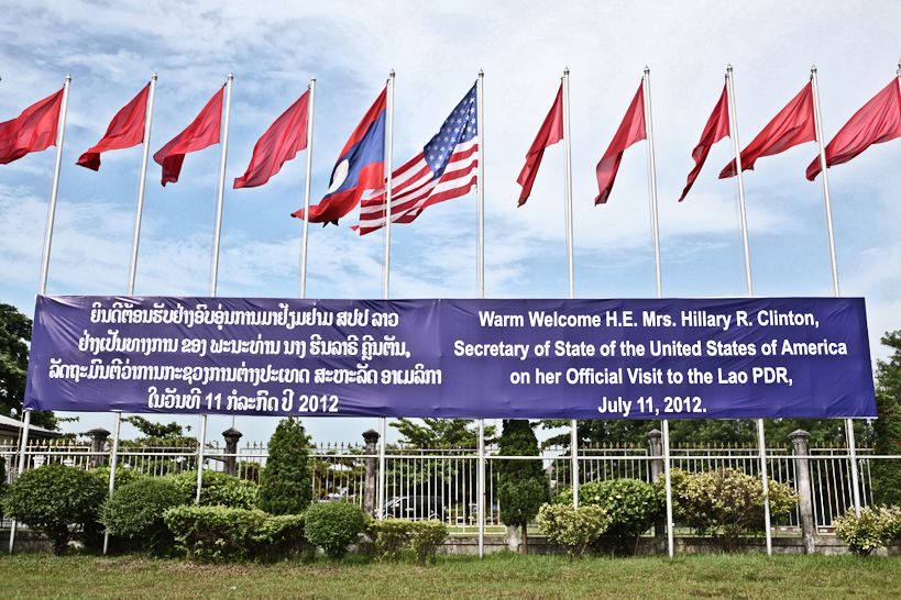 Erstmals seit 1955 (!) besucht ein US-Außenminister Laos: Hillary Clinton macht einen vierstündigen Zwischenhalt in Laos. Sie verabredet mit dem laotischen Ministerpräsidenten Thongsing Thammavong Zusammenarbeit bei der Beseitigung der Folgen des verbrecherischen geheimen Kriegs der USA in Laos (1964 - 1973). Durch Blindgänger werden jetzt noch unzählige Laoten getötet oder schwer verletzt.