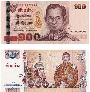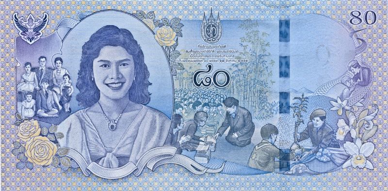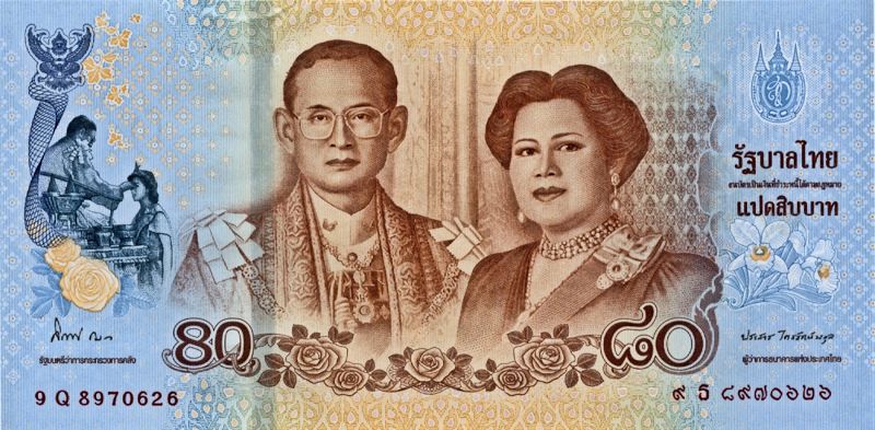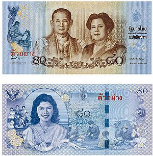 Zur Ehre des 80. Geburtstags der Königin (2012-08-12) und des 60. Geburtstags des Kronprinzen (2012-07-28) hat die Bank of Thailand 80-Baht-Noten (Königin) und 100-Baht-Noten (Kronprinz) ausgegeben.
