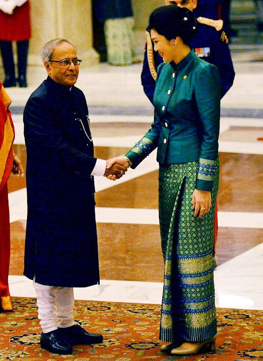 Ministerpräsidentin Yingluck Shinawatra (ยิ่งลักษณ์ ชินวัตร, 1967 - ) trifft in Delhi den indischen Präsidenten Pranab Kumar Mukherjee (প্রনব কুমার মুখার্জী, 1935 - )