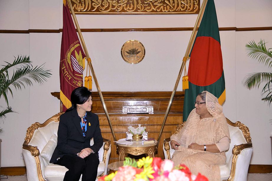 Ministerpräsidentin Yingluck trifft in Dakka die Ministerpräsidentin von Bangladesh (বাংলাদেশ), Sheik Hasina (শেখ হাসিনা, 1947 - ).