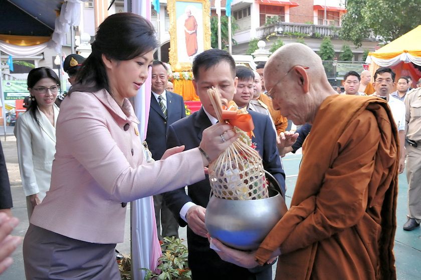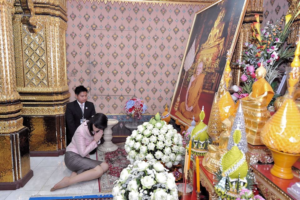 Ministerpräsidentin Yingluck verehrt den Bo-Baum (ต้นพระศรีมหาโพธิ์)