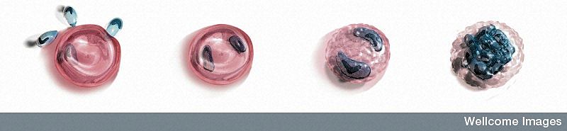 "Life cycle of Plasmodium falciparum in RBC. Illustration of the blood stages in the life cycle of Plasmodium falciparum, the parasite that causes malaria. Initially, in its merozoite form it attaches to and invades the red blood cell. It them develops from a ring stage to its trophozoite form. It then inserts its own proteins into the red blood cell membrane. 48 hours after the cell was first infected the parasite forms a schizont. The red blood cell then ruptures releasing 8-12 merozoites into the circulation which invade more red blood cells."