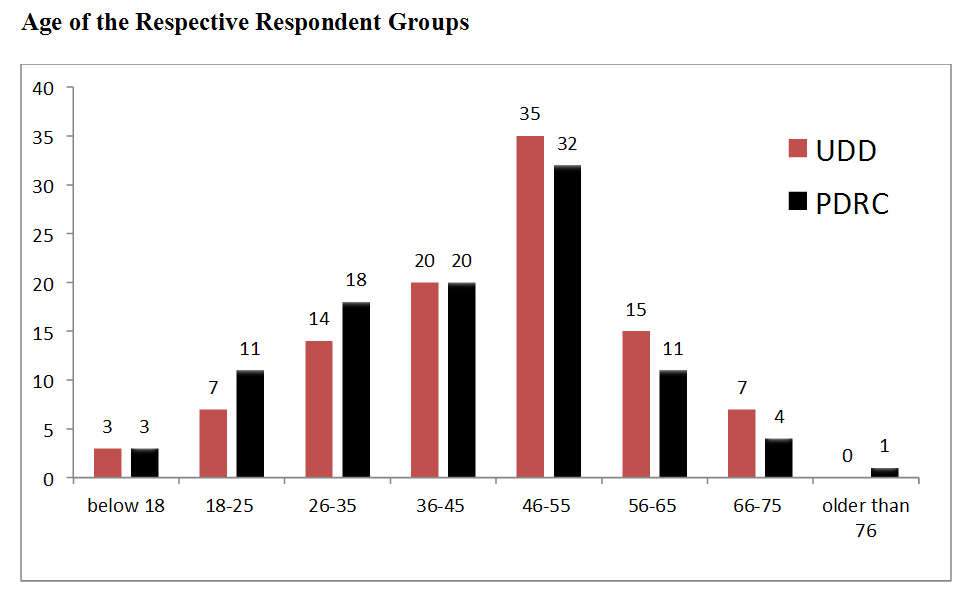 Abb.: Age of the respective respondent group (UDD = United Front for Democracy against Dictatorship - นวร่วมประชาธิปไตยต่อต้านเผด็จการแห่งชาติ ; PDRC = People’s Democratic Reform Committe - คณะกรรมการประชาชนเพื่อการเปลี่ยนแปลงประเทศไทยให้เป็นประชาธิปไตยที่สมบูรณ์ อันมีพระมหากษัตริย์ทรงเป็นประมุข, กปปส.)